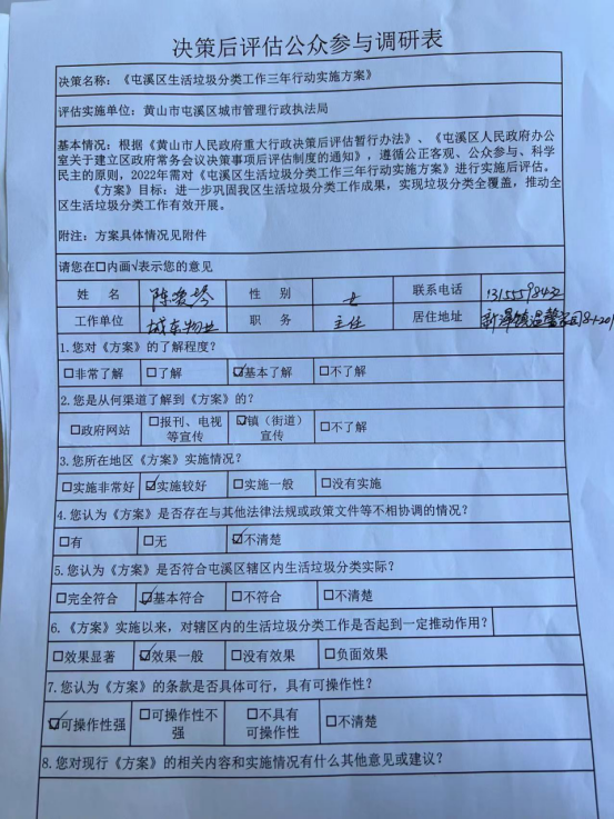 2022年9月,我局制定了《<屯溪区生活垃圾分类工作三年行动实施方案>后评估方案》,成立由局分管领导为组长,环卫中心主任为副组长,以及相关股室人员为成员的后评估工作小组,明确了评估的内容、步骤、方法等内容。遵循公开透明、公众参与的原则,采取通过局政务网站公开征询意见以及到各社区实地调研、发放问卷调查的方式征求各小区工作人员以及利益关系群体的意见,全面了解《方案》实施成效。结合《方案》实施以来,屯溪区垃圾分类工作开展的实际情况,形成评估意见,评估报告并经区司法局予以审核。