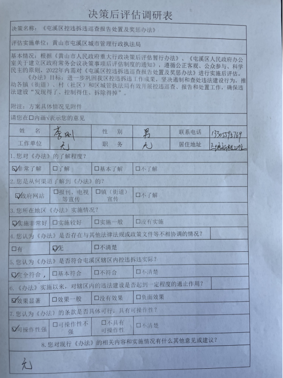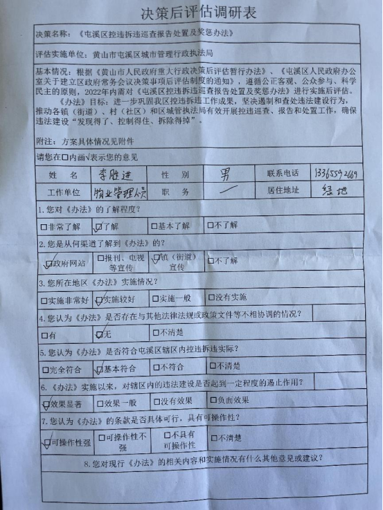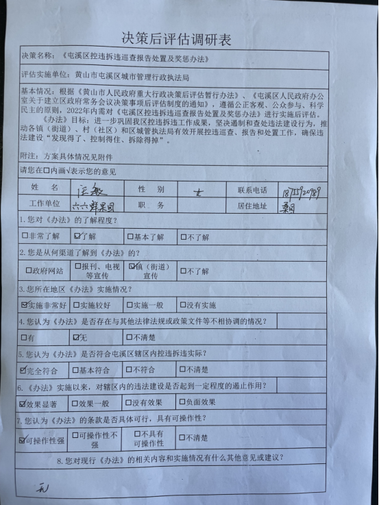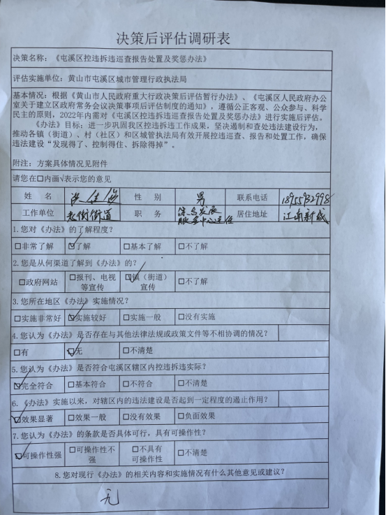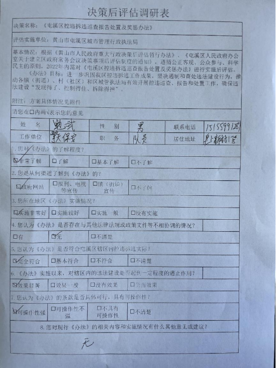 2022年9月,我局制定了《<屯溪区控违拆违巡查报告处置及奖惩办法>后评估方案》,成立由局分管领导为组长,协管副大队长为副组长,以及相关股室人员为成员的后评估工作小组,明确了评估的内容、步骤、方法等内容。遵循公开透明、公众参与的原则,采取通过局政务网站公开征询意见以及到各镇街实地调研、发放问卷调查的方式征求各镇街从事控违拆违工作人员以及利益关系群体的意见,全面了解《办法》实施成效。结合《办法》实施以来,屯溪区控违拆违巡查、处置工作开展的实际情况,形成评估意见,评估报告并经区司法局予以审核。