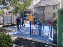 1.告示牌 2.双位太空漫步机 3.跷跷板 4.手摇按摩练习器 5.压腿勾腿训练器 6.健身车 (原器材破损严重、超使用年限) |