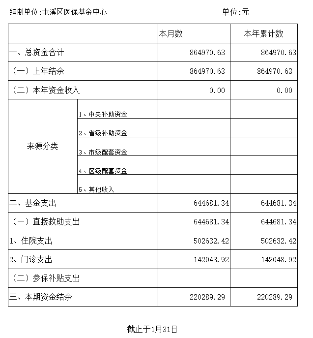 2026年1月屯溪区城乡医疗救助资金筹集及使用情况表
