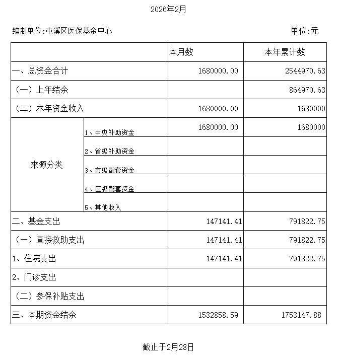 2026年2月屯溪区城乡医疗救助资金筹集及使用情况表