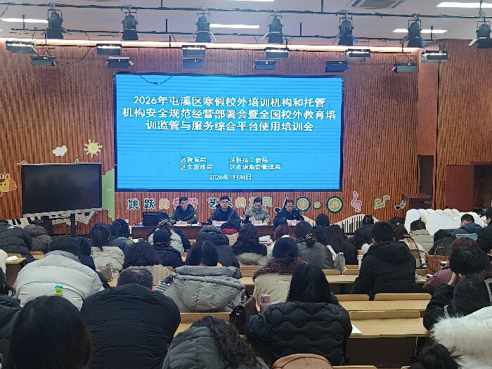 岁末年初,寒假将至。为切实压实校外培训机构和托管机构安全管理责任,规范经营服务行为,守护辖区学生生命财产安全,确保寒假期间培训市场平稳有序,1 月 30 日上午,屯溪区在龙山实验小学报告厅召开 2026 年寒假校外培训机构和托管机构安全规范经营部署会暨全国校外教育培训监管与服务综合平台使用培训会。区教育局、区科技工信局、区文旅体局、区市场监督管理局分管领导,以及全区校外培训机构、托管机构负责人参加会议。