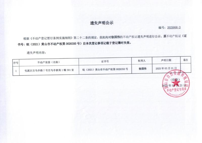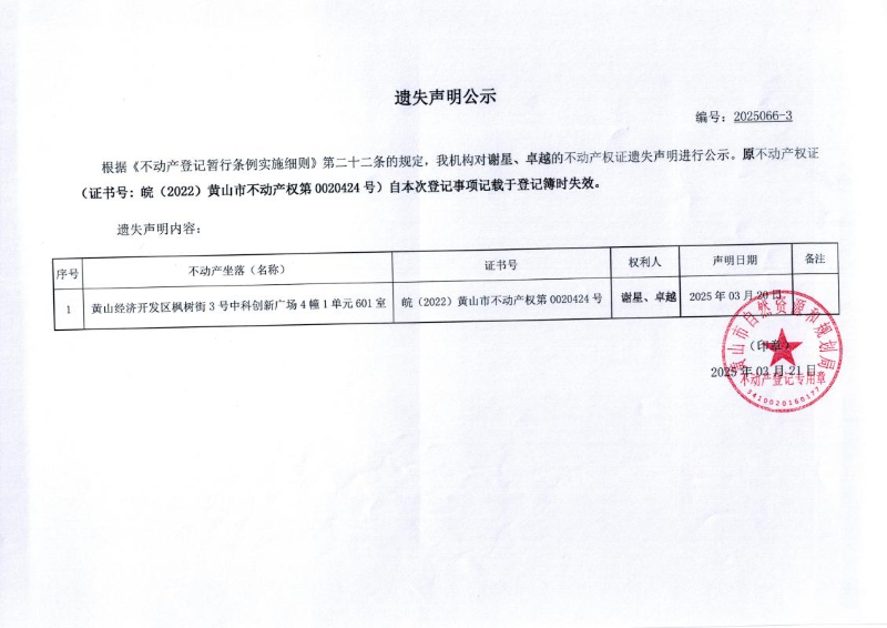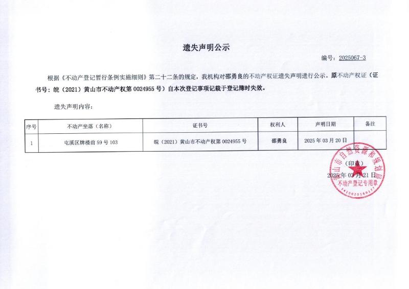 遗失声明公示(2025066-3、2025067-3、2025068-3、2025069-3)