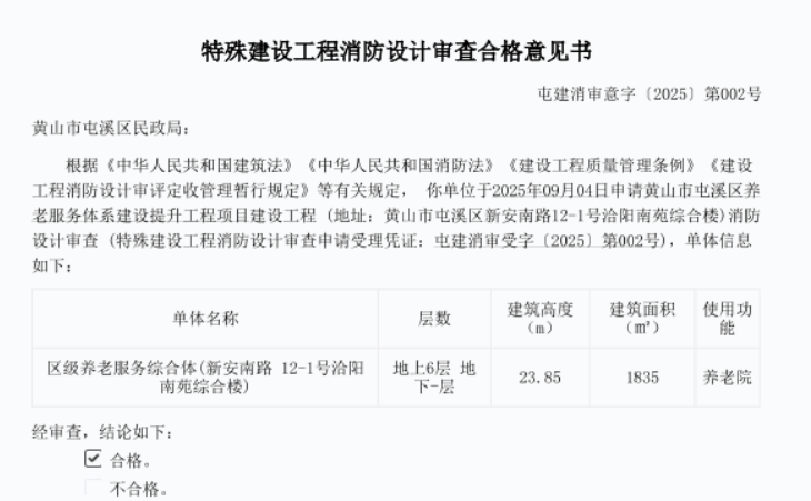 屯溪区养老服务体系建设提升工程项目建设工程消防验收备案