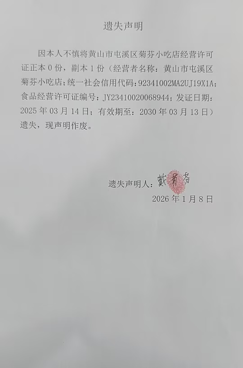 食品经营许可证遗失声明(黄山市屯溪区菊芬小吃店)