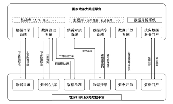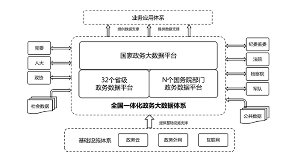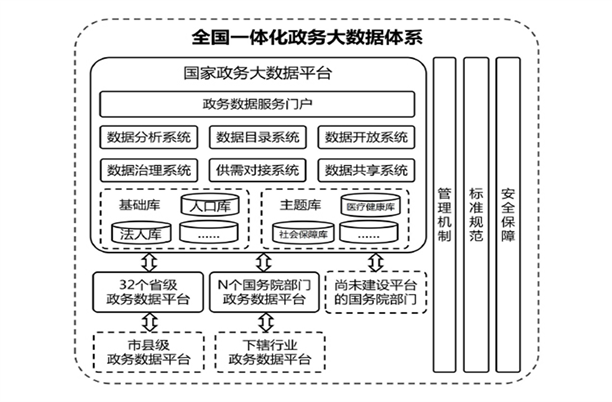 全国一体化政务大数据体系包括三类平台和三大支撑。三类平台为“1+32+N”框架结构。“1”是指国家政务大数据平台,是我国政务数据管理的总枢纽、政务数据流转的总通道、政务数据服务的总门户;“32”是指31个省(自治区、直辖市)和新疆生产建设兵团统筹建设的省级政务数据平台,负责本地区政务数据的目录编制、供需对接、汇聚整合、共享开放,与国家平台实现级联对接;“N”是指国务院有关部门的政务数据平台,负责本部门本行业数据汇聚整合与供需对接,与国家平台实现互联互通,尚未建设政务数据平台的部门,可由国家平台提供服务支撑。三大支撑包括管理机制、标准规范、安全保障三个方面。