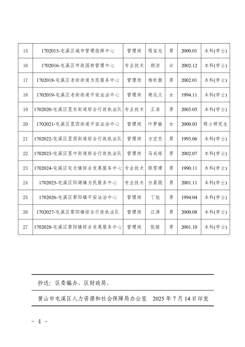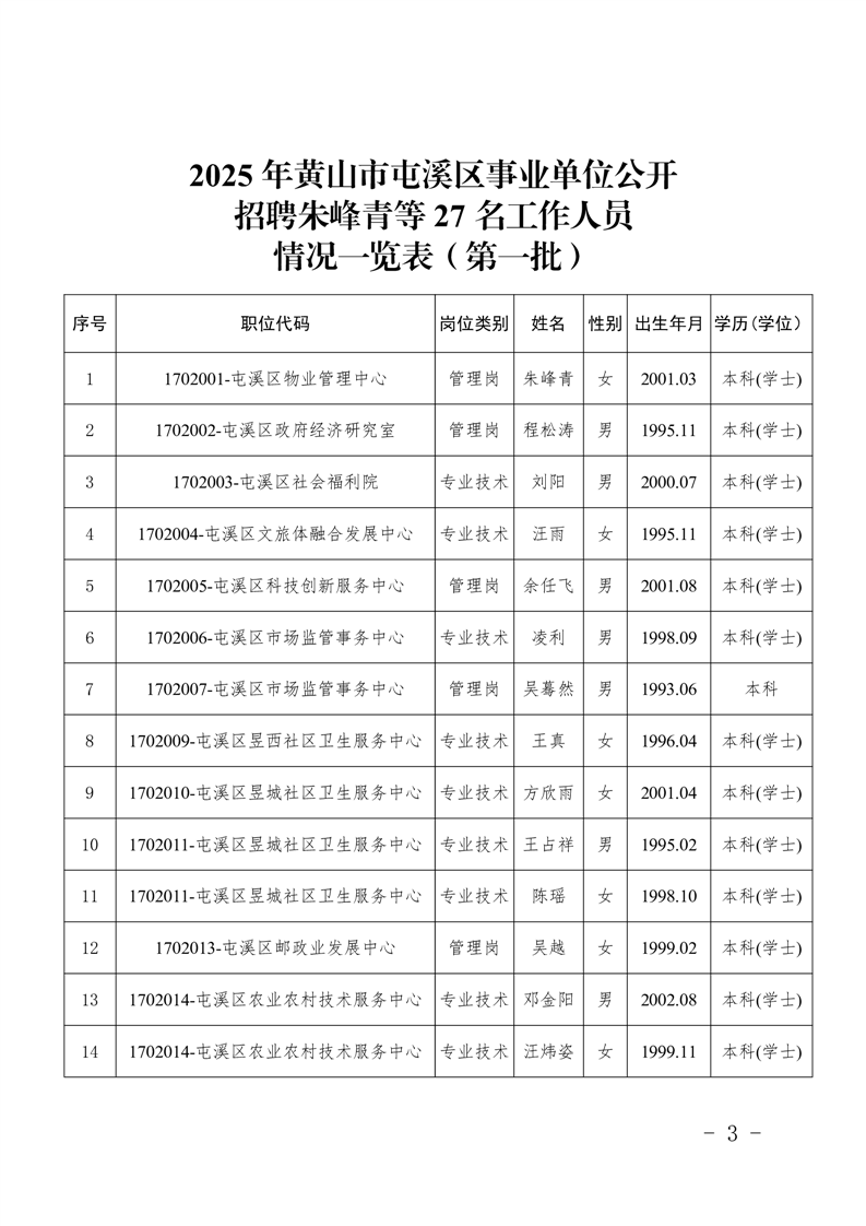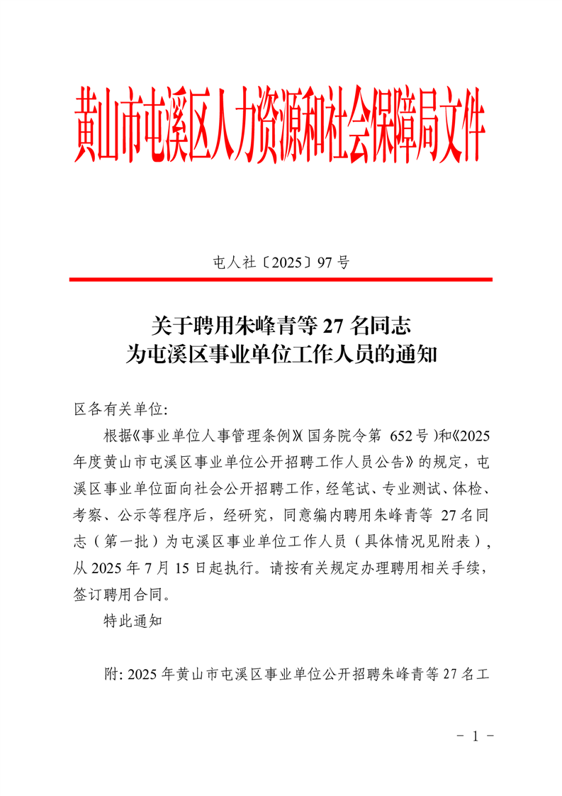 关于聘用朱峰青等 27 名同志为屯溪区事业单位工作人员的通知