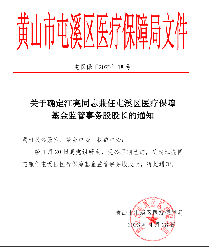 关于确定江亮同志兼任屯溪区医疗保障基金监管事务股股长的通知