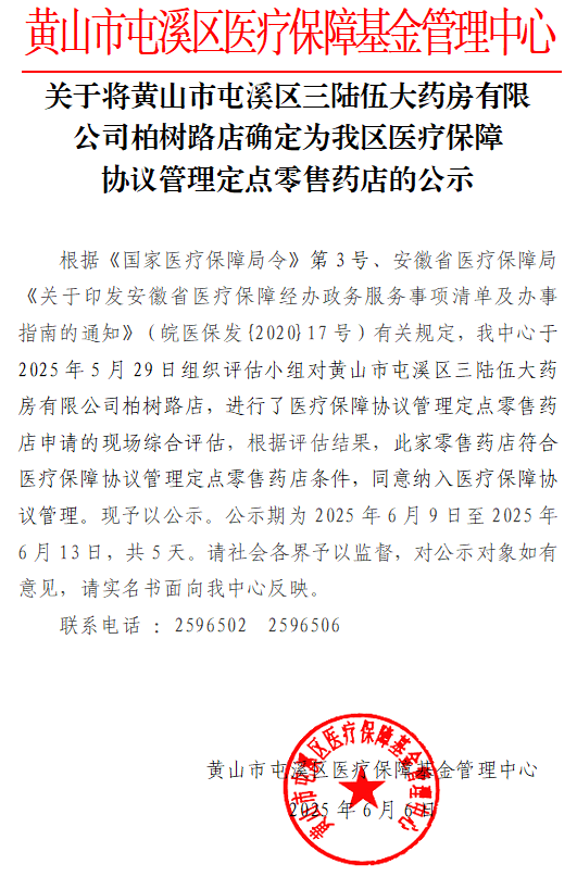 关于将黄山市屯溪区三陆伍大药房有限公司柏树路店确定为我区医疗保障协议管理定点零售药店的公示