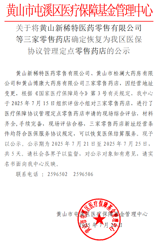 关于将黄山新稀特医药零售有限公司等三家零售药店确定恢复为我区医保协议管理定点零售药店的公示