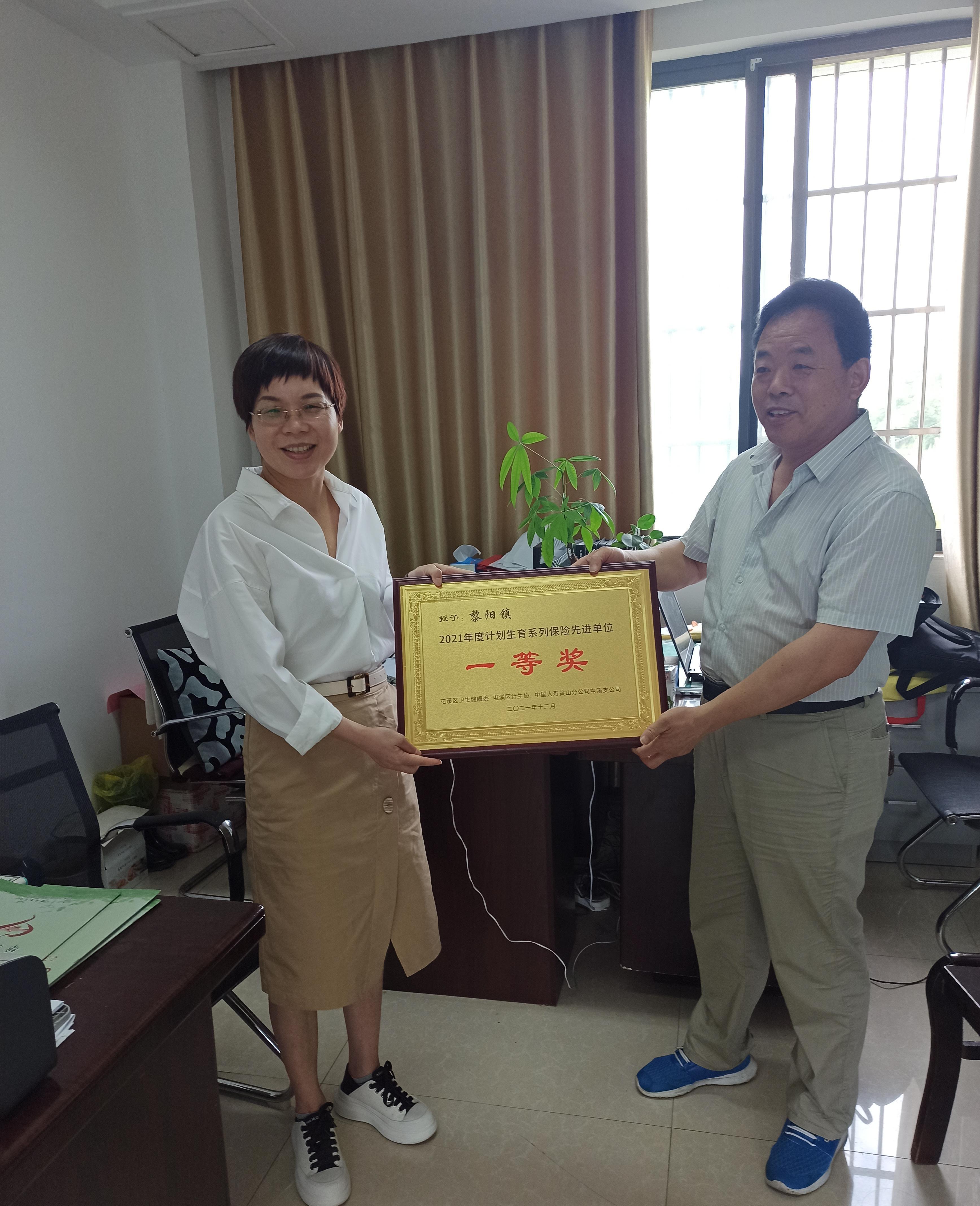 6月8日上午,屯溪区卫生健康委和中国人寿保险公司来到黎阳镇,授予黎阳镇“2021年度计划生育系列保险先进单位”一等奖和“2021年老年人意外伤害保险先进单位”二等奖奖牌。并为新江村程锦娟和三门呈程彩红颁发“先进个人”荣誉证书以及奖品。