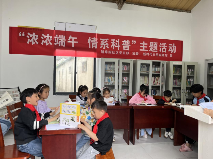 隆阜四社区充分发挥农家书屋平台资源和阵地优势,组织辖区儿童品读端午节经典诗词作品、朗诵诗词以纪念爱国诗人屈原,同时给孩子们讲述中国传统节日端午节的习俗和由来。琅琅读书声伴随浓厚的节日氛围飘散开来,激发了小小读者们对中国传统文化的兴趣和爱国主义情感。