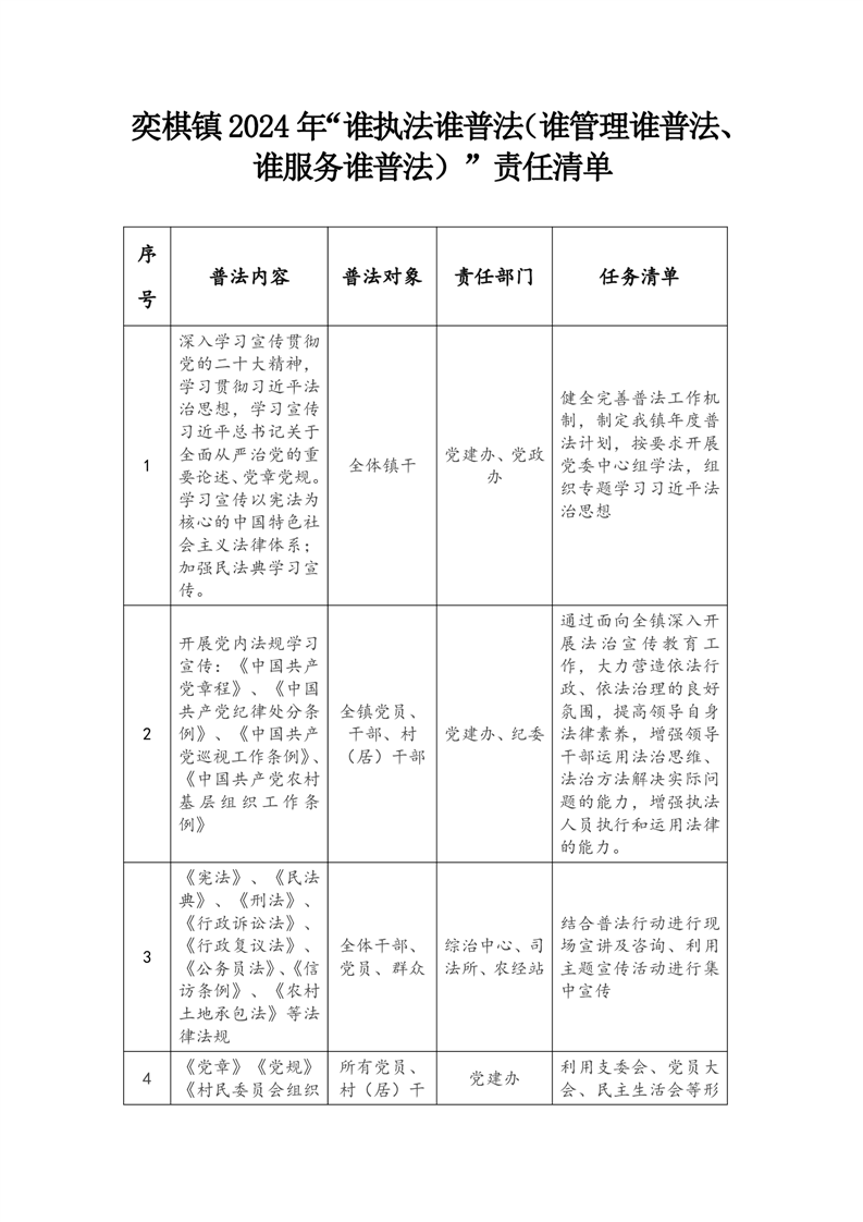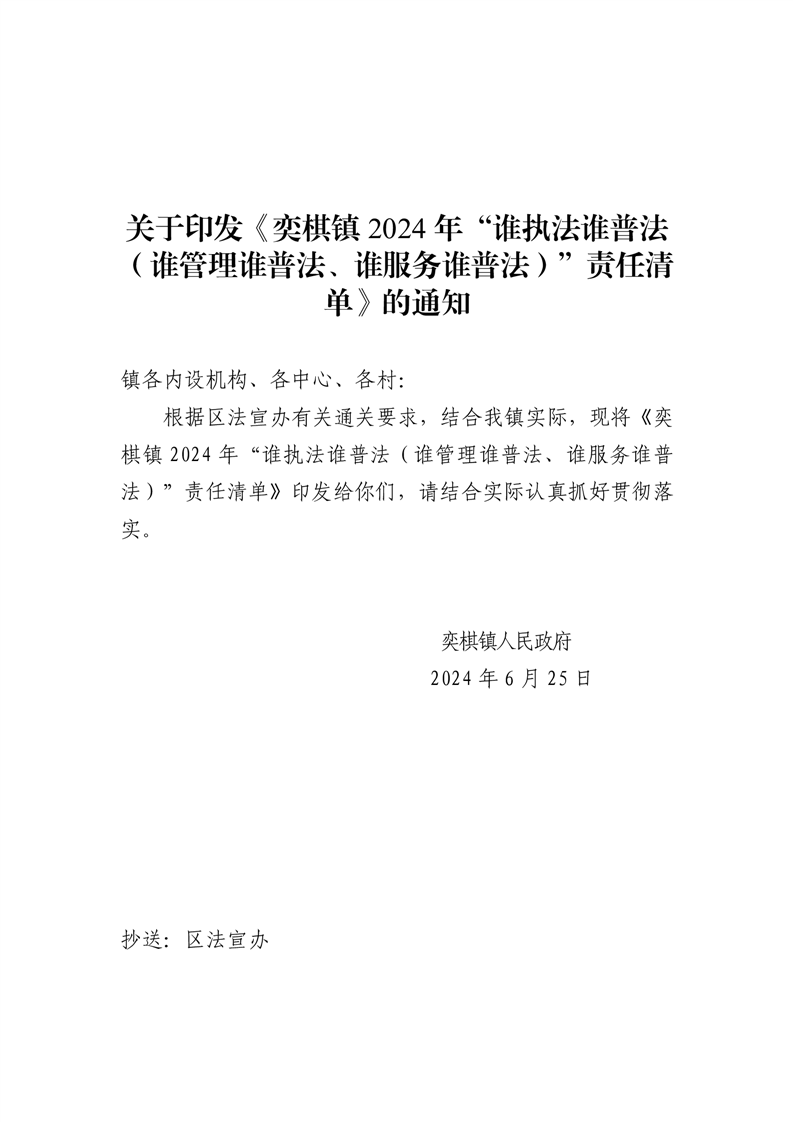 关于印发《奕棋镇2024年“谁执法谁普法(谁管理谁普法、谁服务谁普法)”责任清单》的通知
