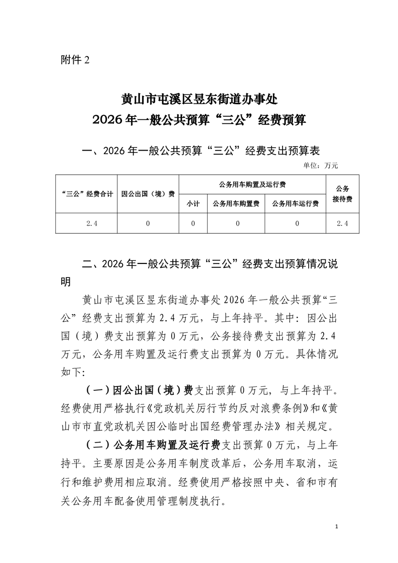 黄山市屯溪区昱东街道办事处2026年一般公共预算“三公”经费预算