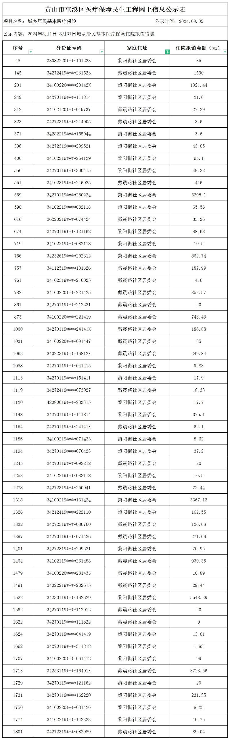 民生工程屯溪区昱西街道2024年8月1日-8月31日城乡居民基本医疗保险待遇享受人员信息公示