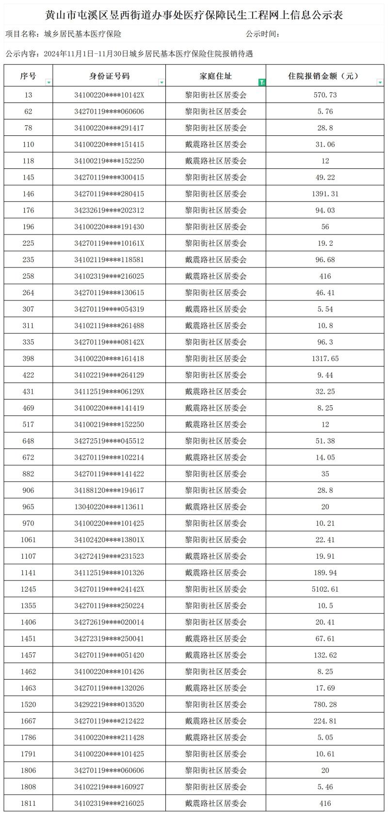 民生工程屯溪区昱西街道2024年11月1日-11月30日城乡居民基本医疗保险待遇享受人员信息公示