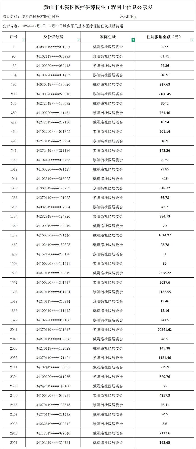 民生工程屯溪区昱西街道2024年12月1日-12月31日城乡居民基本医疗保险待遇享受人员信息公示