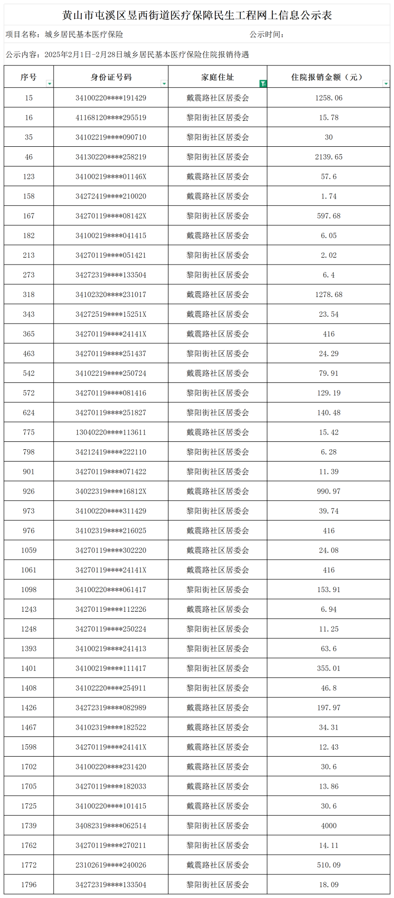 民生工程屯溪区昱西街道2025年2月1日-2月28日城乡居民基本医疗保险待遇享受人员信息公示