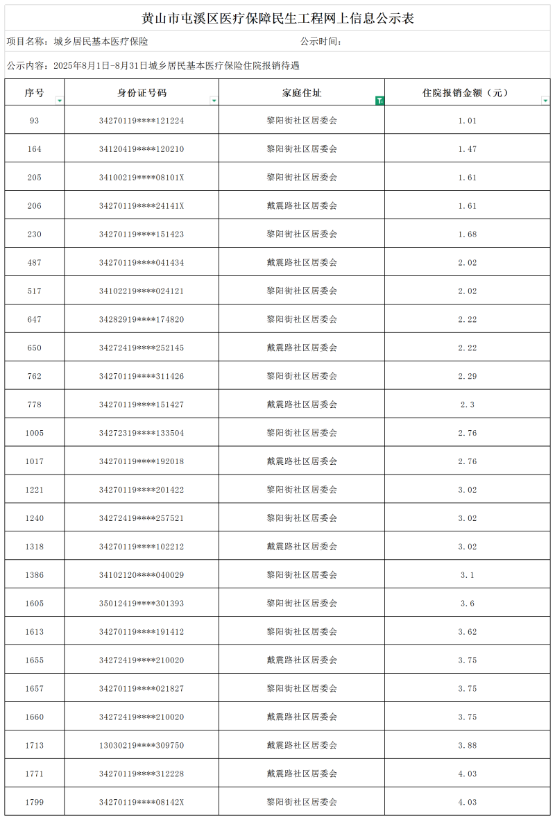 民生工程屯溪区昱西街道2025年8月1日-8月31日城乡居民基本医疗保险待遇享受人员信息公示