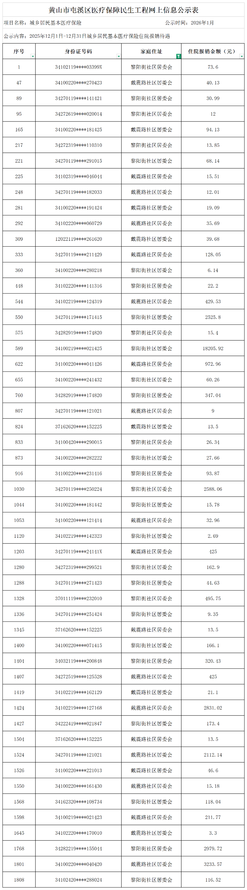民生工程屯溪区昱西街道2025年12月1日-12月31日城乡居民基本医疗保险待遇享受人员信息公示