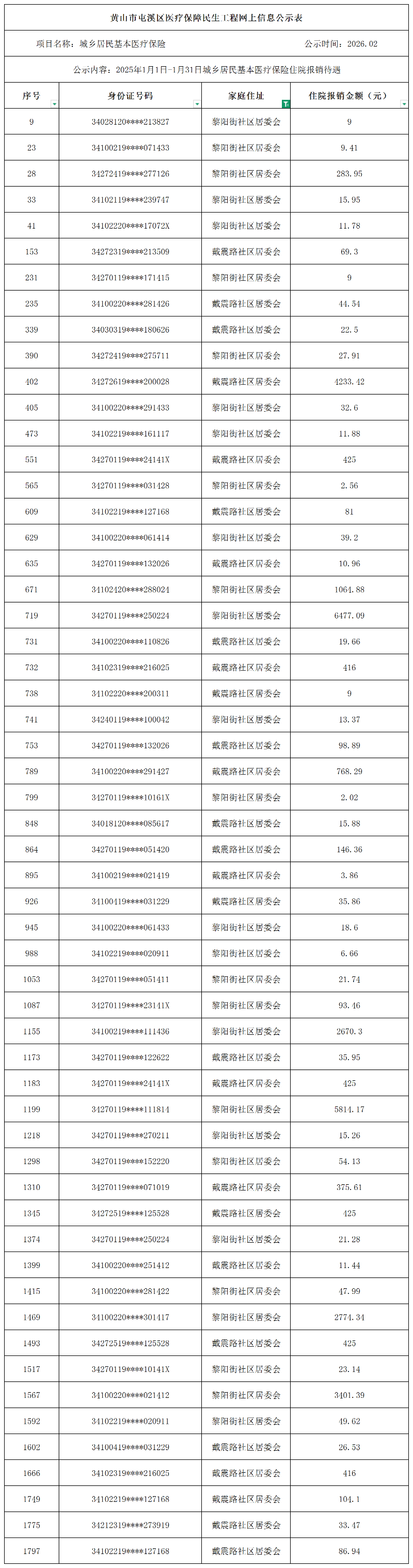 民生工程屯溪区昱西街道2026年1月1日-1月31日城乡居民基本医疗保险待遇享受人员信息公示