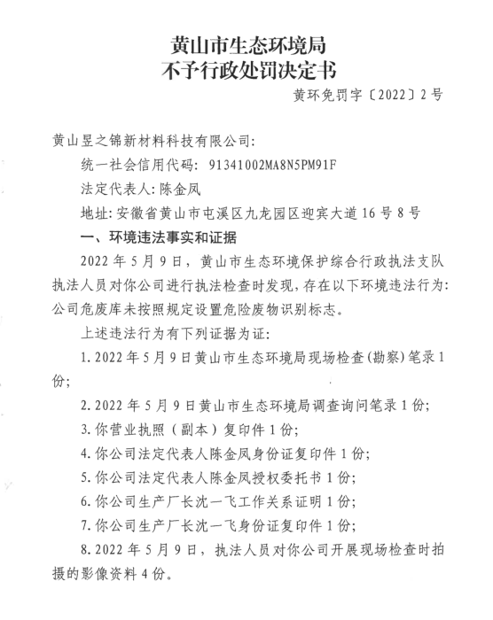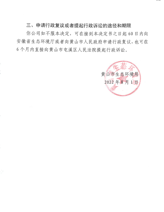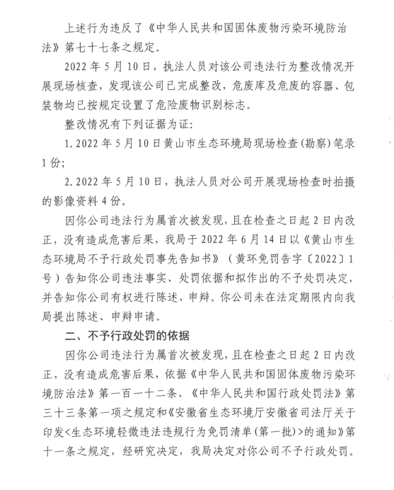 【主动回应】黄山市生态环境局不予行政处罚决定书
