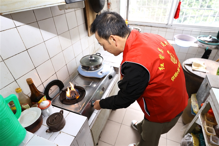在占川河新村,志愿者背着沉甸甸的红背篓,敲开了77岁王甫生大爷的家门,将老人点购的大米送进屋内。放下物资后,志愿者还仔细检查了厨房燃气灶的安全状况,并叮嘱大爷做饭时一定要开窗通风,注意用火安全。