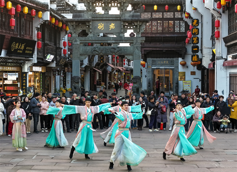 2025年12月31日,演员在安徽省黄山市屯溪老街表演国风舞蹈剧。