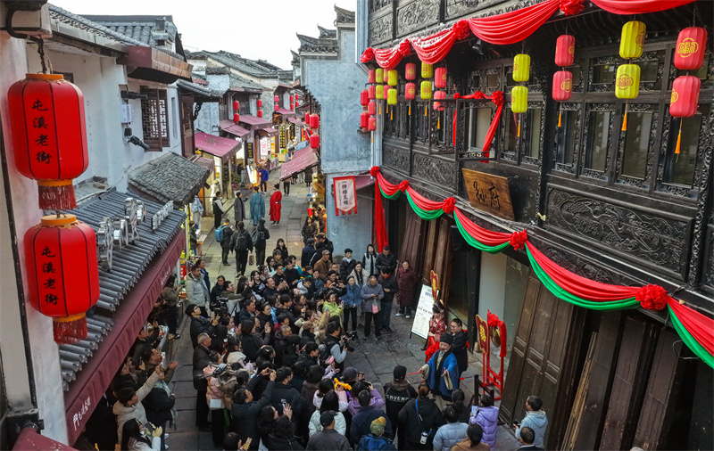 2025年12月31日,NPC在安徽省黄山市屯溪老街与游客互动。