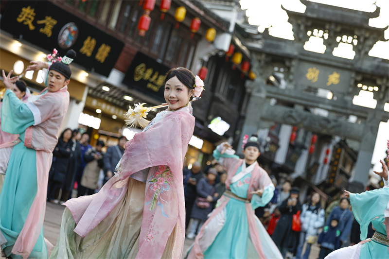 当日,“来屯嬉”沉浸式演绎活动在黄山市屯溪老街精彩上演。身穿古风服装的演员以灵动的舞姿,演绎出《清明上河图》中的市井繁华画卷,沿街设置的NPC(非玩家角色)与游客趣味互动,共同迎接新年。新华网发(施亚磊 摄)