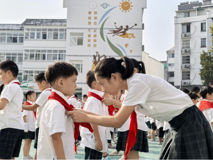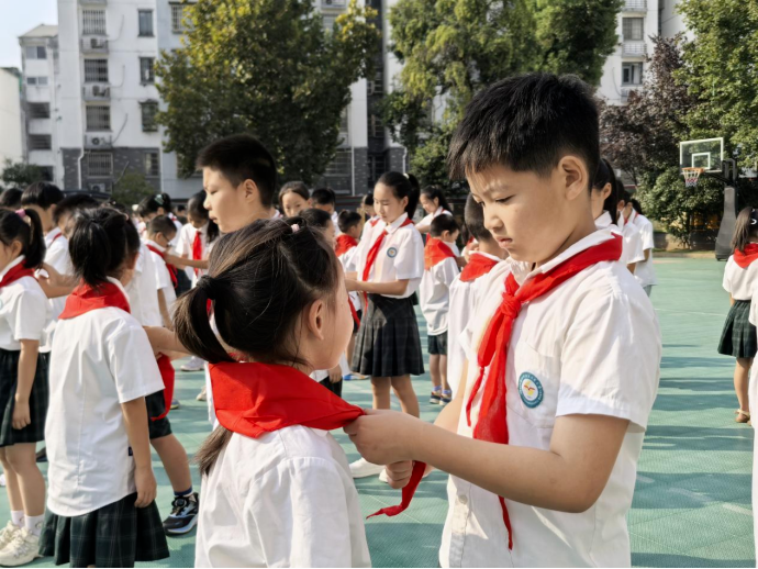 活动现场,少先队员们还表演了军体拳。随后,高年级的队员为新入队的小队员们系上鲜艳的红领巾,他们在队旗下庄严宣誓,承诺积极履职、贡献力量。