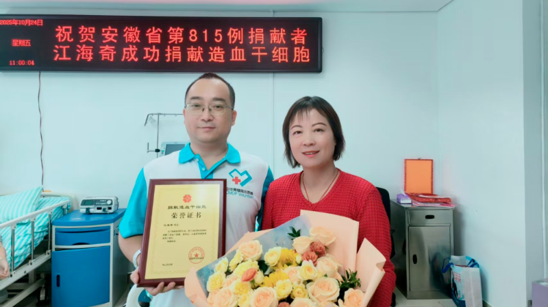 在合肥,江海奇轻轻握着那份温热的造血干细胞采集袋,仿佛能触摸到另一个家庭重燃的希望。他说:“特别感谢妻子和父母,他们的无私支持让我安心完成捐献。父母那句‘能救人是福报’的叮嘱,孩子把‘爸爸是救人英雄’写进作文的骄傲,都成为支撑我的力量。生命的长河因善意交汇而奔涌不息。当我想到这份‘生命种子’即将萌芽在另一个躯体里,更深刻体会到志愿者证书的分量。愿更多朋友加入这场爱心接力,让每个等待中的生命都能遇见光。”