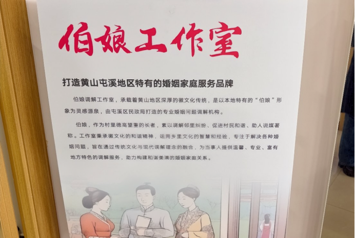 “为深入推进婚俗改革,屯溪区民政局通过‘昱城有爱幸福家’一站式婚姻家庭辅导服务项目,植耕于屯溪区婚俗精髓,将‘伯娘’这一在屯溪地区社会中扮演着重要媒介作用的传统角色与现代婚姻家庭服务相结合,打造屯溪区特有的婚姻家庭服务品牌‘伯娘工作室’。” 屯溪区民政局婚姻登记处工作人员张岚介绍,工作室秉持 “以和谐家庭为目标,以专业服务促和谐” 的核心理念,既注重推广传承当地优秀婚俗文化,又着力提供专业化、个性化的婚姻家庭指导,让服务更有温度、更接地气。