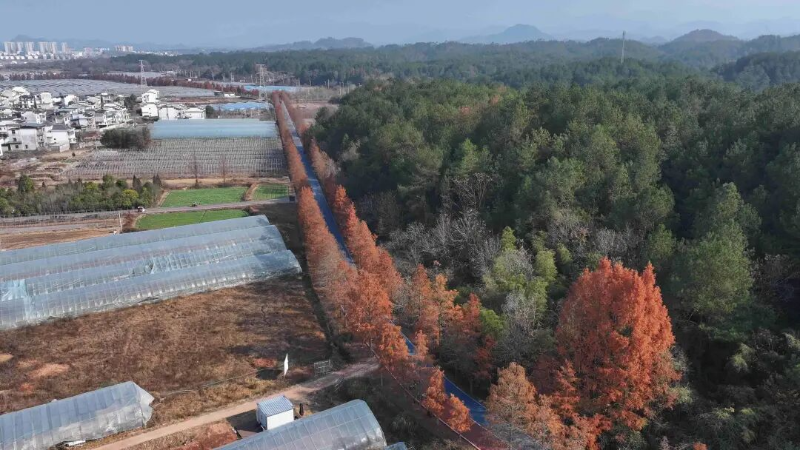 这片惊艳的“红色长廊”并非天生丽质,而是源于十年前的一次生态规划。据了解,这片林木是2013至2014年间在新江村蔬菜基地道路旁种植的池杉林。池杉原产于美国,是一种兼具观赏与实用价值的优良树种。其木材适用于造船和建筑,具有良好的耐水性和抗腐性。每年10至11月,随着气候条件的变化,池杉球形果实逐渐成熟,此时叶片颜色会发生渐变,从翠绿转为金黄,最终泛红,形成极具视觉冲击力的景观。如今,这片林木不仅改善了当地生态环境,更成为知名“网红打卡点”,吸引众多游客前来,实现了生态与经济效益双赢。