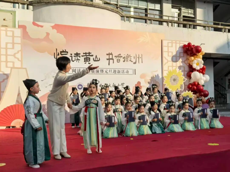 在屯溪大位小学,操场书声琅琅,如清泉流淌心田。孩子们用稚嫩而坚定的声音诵读《悯农》《春晓》等经典诗篇,在琅琅书韵中赓续中华文脉,传承文化基因。随后,各年级学生轮番登台,以情景剧、创意走秀、舞蹈表演等艺术形式倾情演绎,精彩纷呈,将节日气氛一次次推向高潮。舞台上的一举一动、一吟一诵,尽显少年儿童朝气蓬勃的精神风貌,也生动展现了学校美育工作的丰硕成果与文化育人的深层成效。“今天我表演的是《曙光》,讲述了一个动人的红色故事。新的一年,我将铭记革命前辈吃苦耐劳、无私奉献的精神,在学习上更加勤奋,在生活中更加自律,努力做一名有理想、有担当的新时代好少年。”屯溪大位小学学生范芝栖坚定地表示。