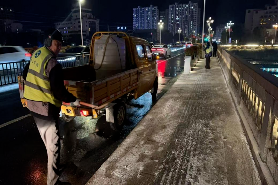 近日,我市遭遇低温雨雪天气,夜间桥面极易凝结冰层,对市民出行安全构成严重威胁。为切实保障城市道路交通秩序与通行安全,屯溪区城市管理局迅速响应、闻令而动,启动应急响应预案,连夜组织市政养护人员,对城区桥梁全力开展除冰保畅专项行动,同步对辖区内山场、观光索桥等区域临时封闭。