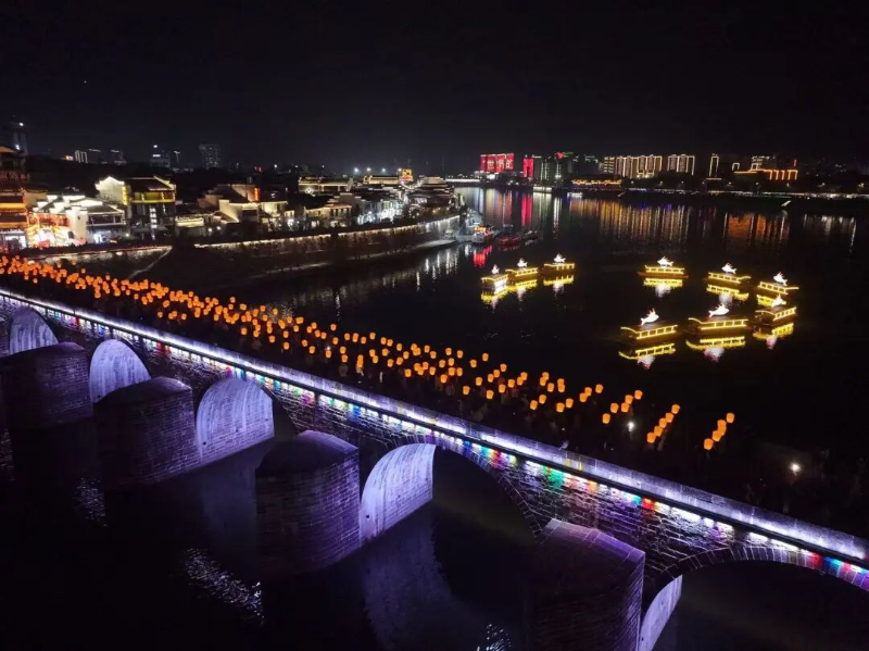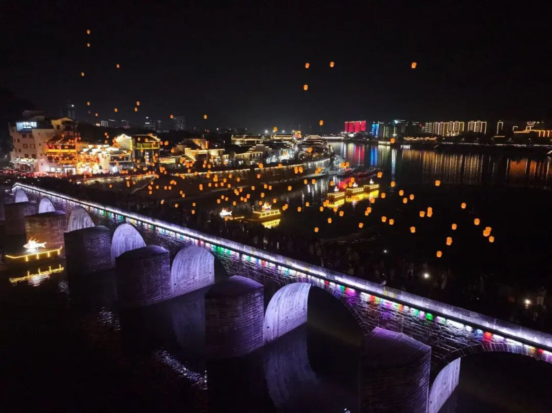 江上,游船缓缓行驶,载着满城灯火与人间暖意,勾勒出独属于屯溪的诗意与繁华。桥上,镇海桥孔明灯祈福仪式温暖启幕,市民游客可写下新年心愿,解锁“云端寄福”的仪式感。岸边,猜灯谜、抽大奖、篝火欢舞轮番上演,让新春的喜乐直达心底。