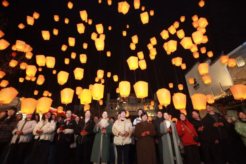 百人花灯队伍踏着青石板路前行,灯影与古街黛瓦白墙相映,徽州匠人的指尖温度与吉祥寓意随风传递。