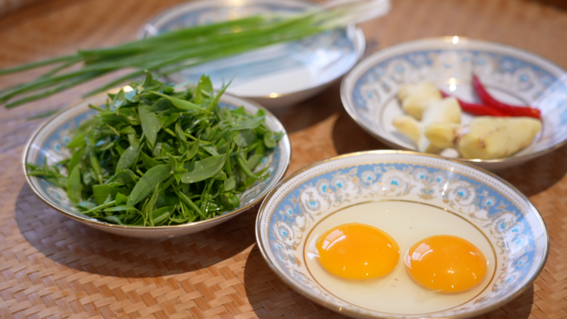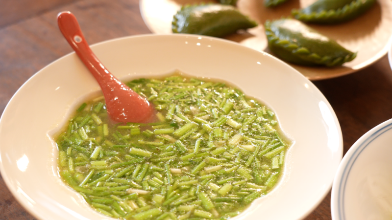 春天的溪水边野生水芹正当时令,村民将嫩茎采摘回来,用清水煮成羹汤。芹香清幽,汤色碧绿,只需要一点盐,便能激发出水芹特有的爽脆与甘香,这便是宋代作家林洪所著的《山家清供》中记载的“碧涧羹”。“屯溪厨房”负责人何两幡介绍道:“林洪他生活在山林之中,每个季节他都记录一些时令的菜。这道汤取名“碧涧羹”,因为它就像春水涨起来,那种碧绿的颜色。”