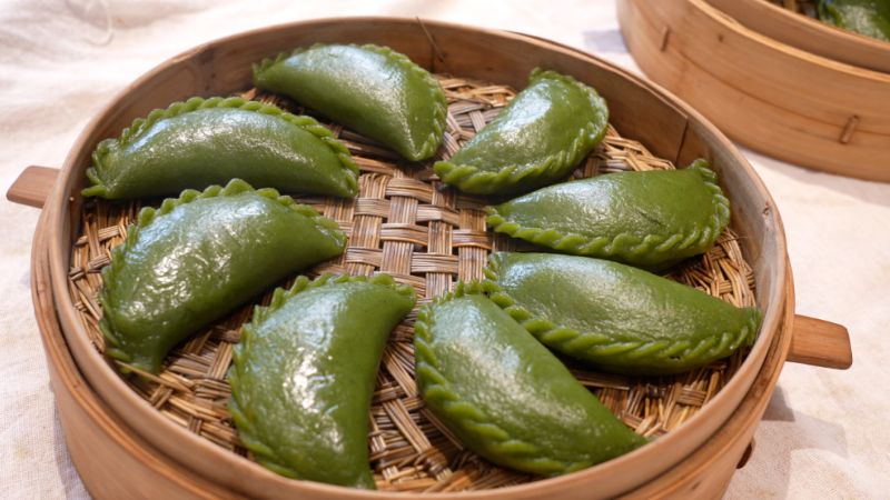 新鲜艾叶配上春笋、鲜肉、咸肉、豆腐干、腌菜等一同炒香,包入翠绿的面皮中,上锅蒸十分钟。刚出锅的艾叶粿色泽翠绿、软糯馅多,咬上一口,艾草的清香与咸鲜的馅料在口中交融,满口都是春天的气息。