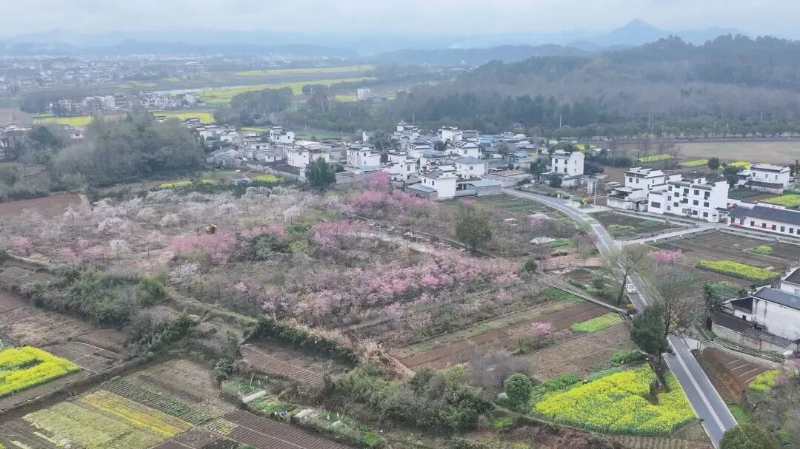 不远处,油菜花田金黄盛放,粉樱与黄花交相辉映,色彩柔和、层次丰富。新安江畔碧水悠悠,与连片花海、乡野村落共同铺展成屯溪春日里独具韵味的水墨画卷,吸引不少市民游客前来踏青赏花、拍照打卡,尽享乡野慢时光。