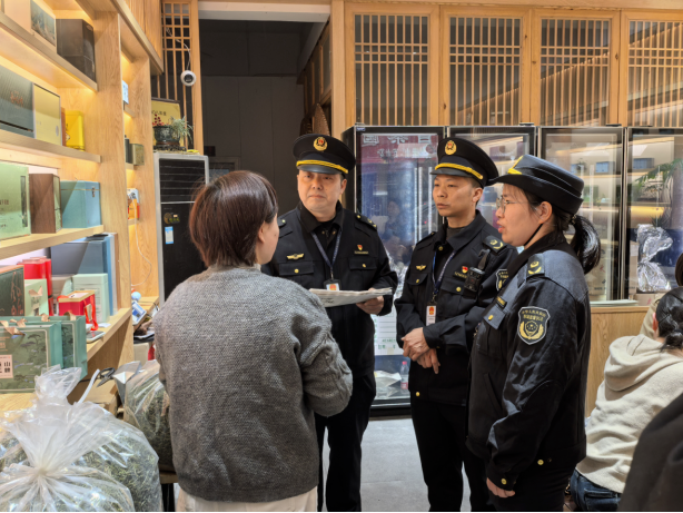 4月8日上午,屯溪区市场监督管理局工作人员来到黄山茶城,逐一走访茶叶经营门店,围绕茶叶产品质量、地理标志使用、是否存在以次充好等行为开展全方位排查,确保春茶来源可溯、质量可靠。