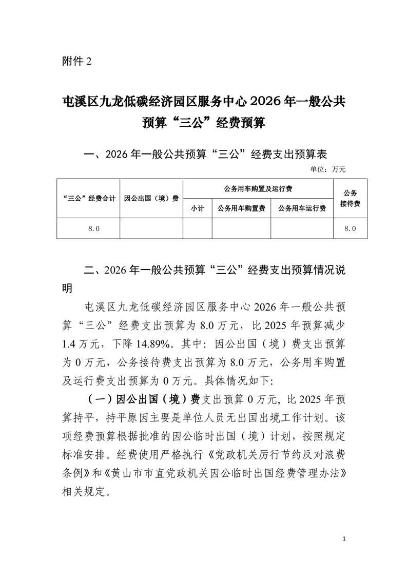 黄山市屯溪区九龙低碳经济园区服务中心2026年一般公共预算“三公”经费预算