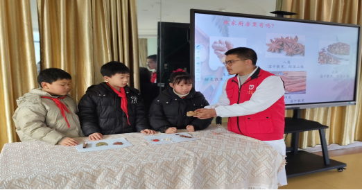 讲座中,屯光镇卫生院徐院长以通俗易懂的语言,从中医药起源、经典药材辨识入手,结合生活实例讲解金银花、菊花等常见中草药的功效与用法,生动解读“望闻问切”基本原理,破除中医药认知误区。现场设置药材实物展示环节,同学们近距离观察药材形态、触摸质地,踊跃提问互动,在实操体验中感受中医药的独特魅力。讲座中还分享了四季养生、日常护眼、预防感冒等实用中医药养生小技巧,引导学生养成健康生活习惯,将中医药智慧融入日常。